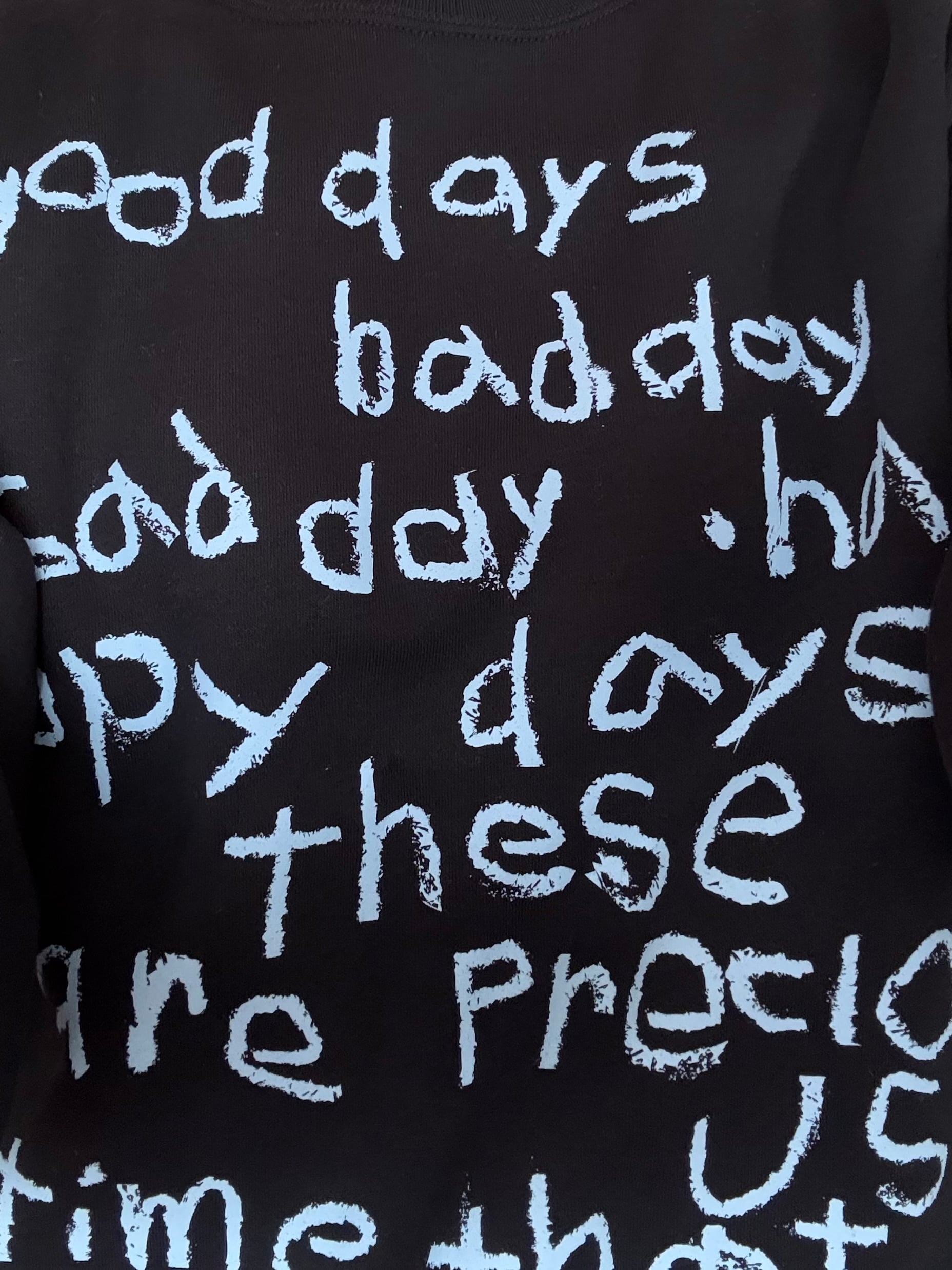 手書きの文章をシルクスクリーンに、後ろの首元には作品キャプションのタイトルや説明が刺繍で施されています。
