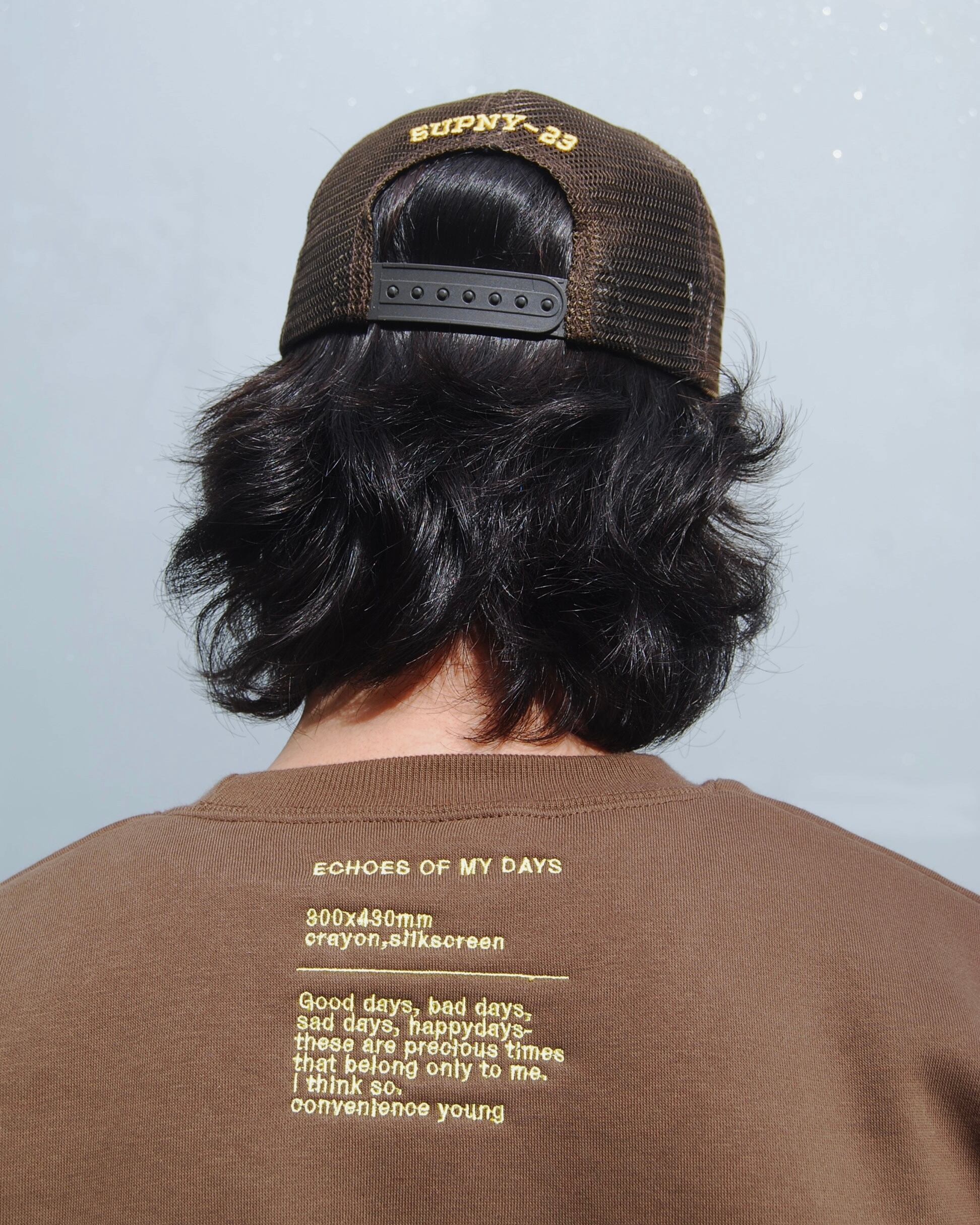 手書きの文章をシルクスクリーンに、後ろの首元には作品キャプションのタイトルや説明が刺繍で施されています。