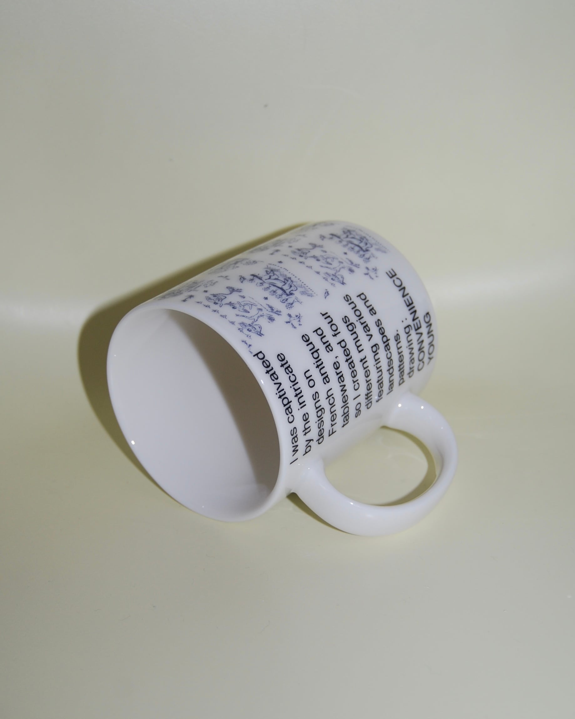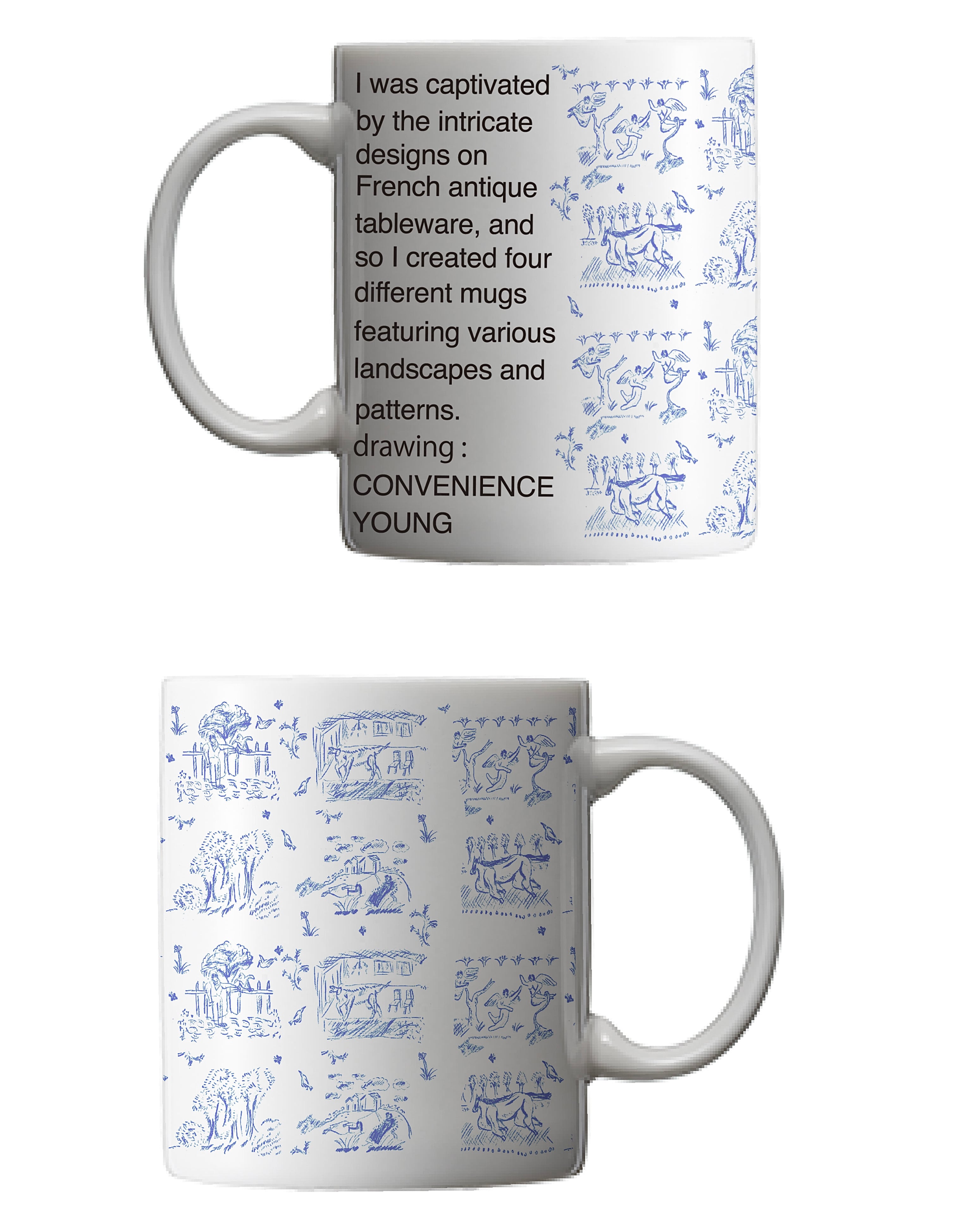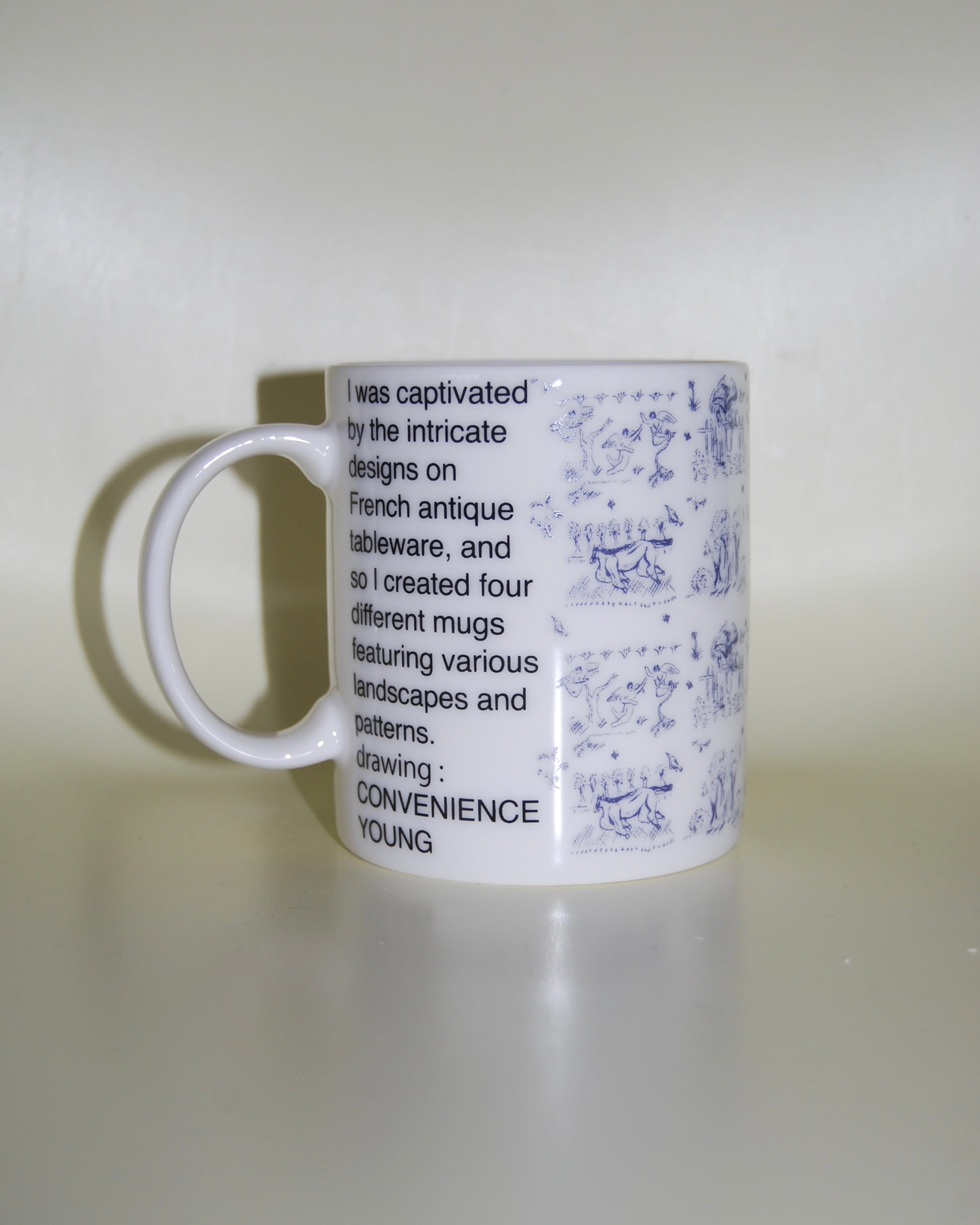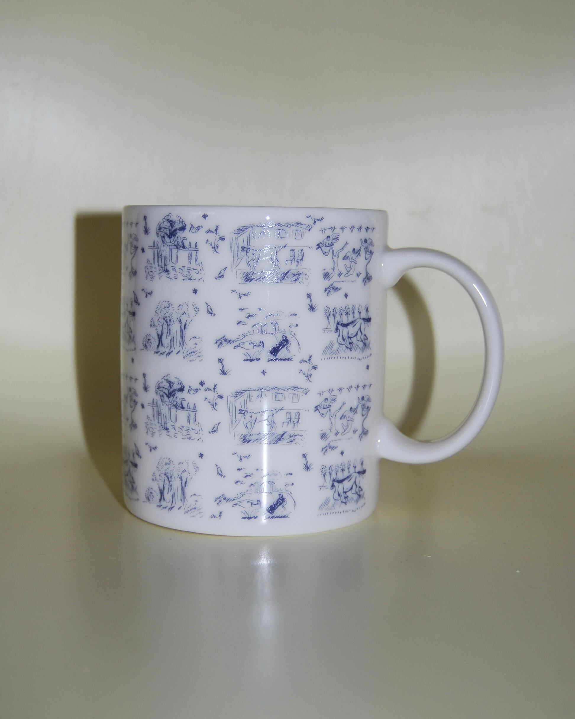 フランスのアンティーク食器の精巧なデザインに魅了され描いた風景画を総柄にしたマグカップ。