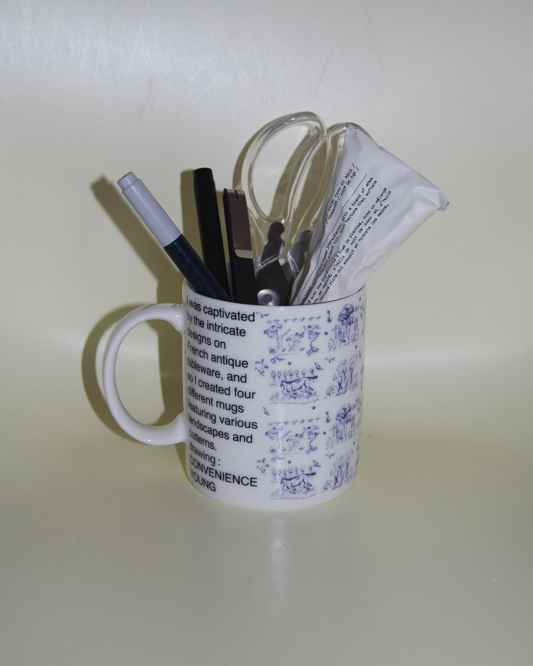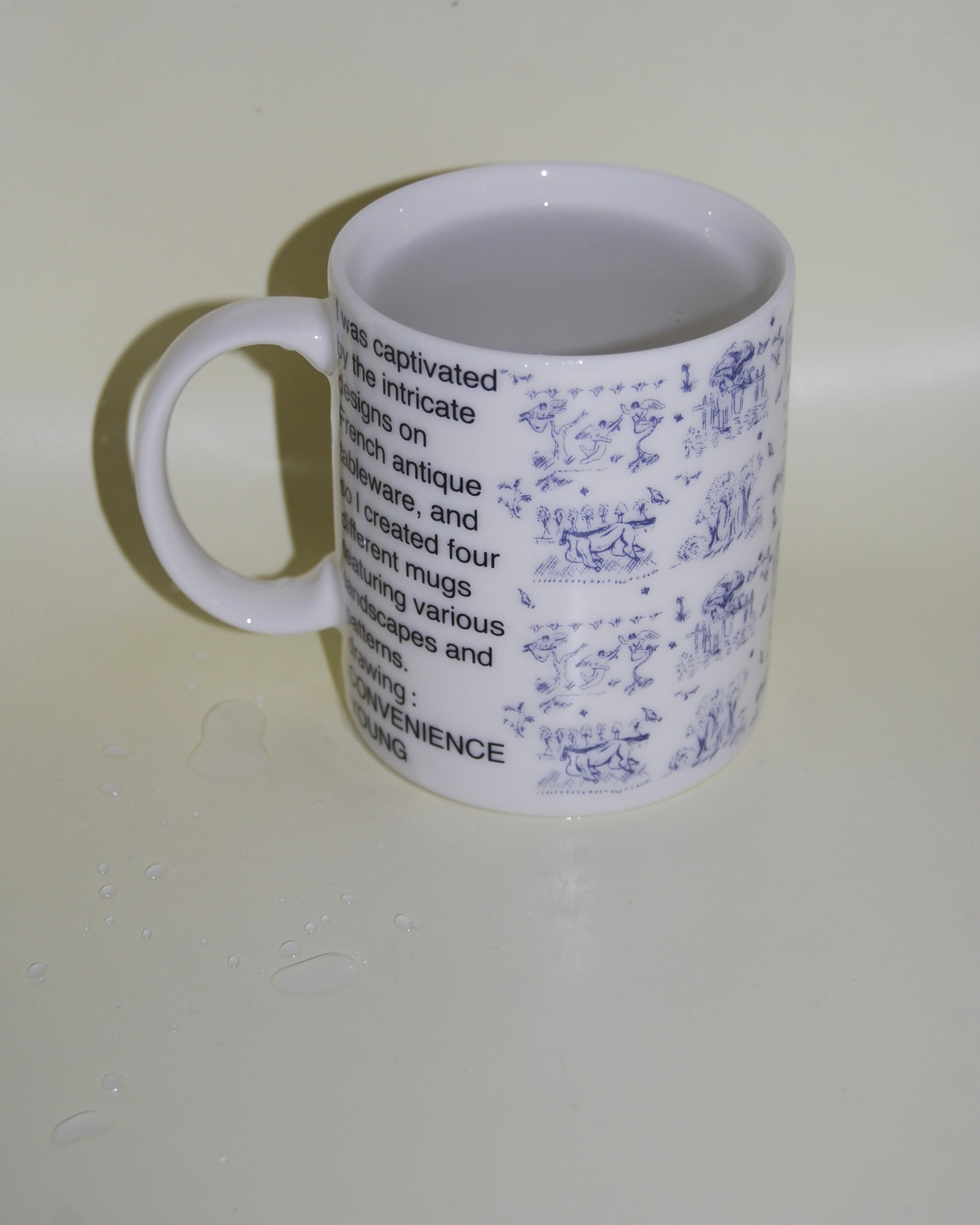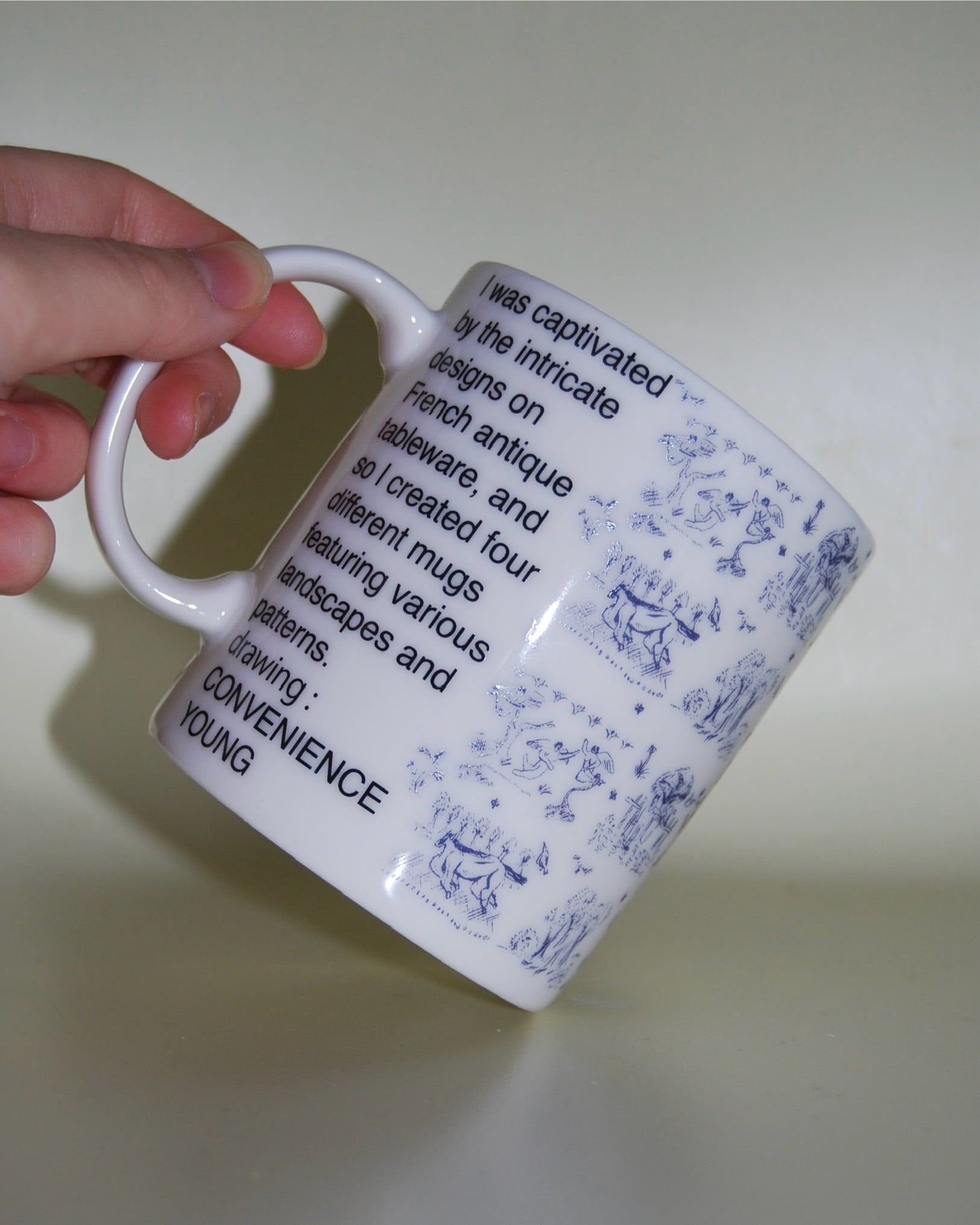 フランスのアンティーク食器の精巧なデザインに魅了され描いた風景画を総柄にしたマグカップ。